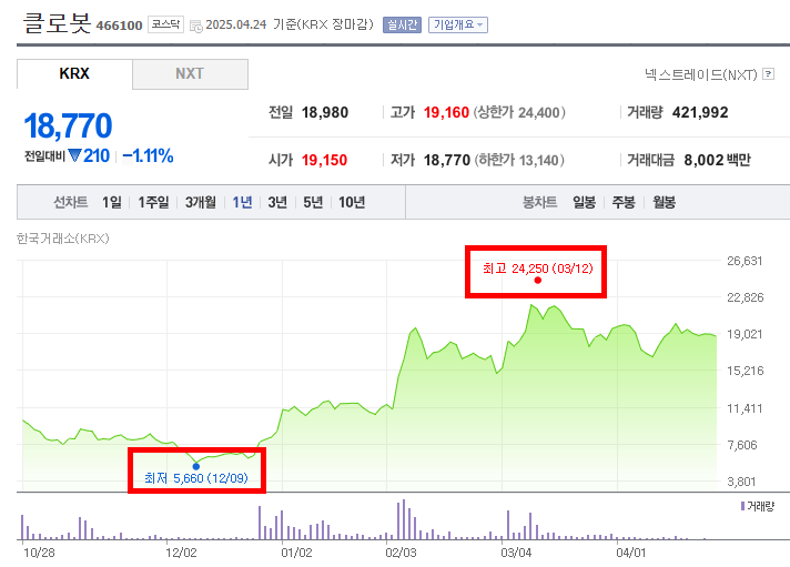 - 2025년 2월부터 주가는 가파르게 상승하기 시작하여 3월 12일에는 최고점인 24,250원을 기록했다. 이는 단기간에 매우 큰 폭으로 상승한 것이다.