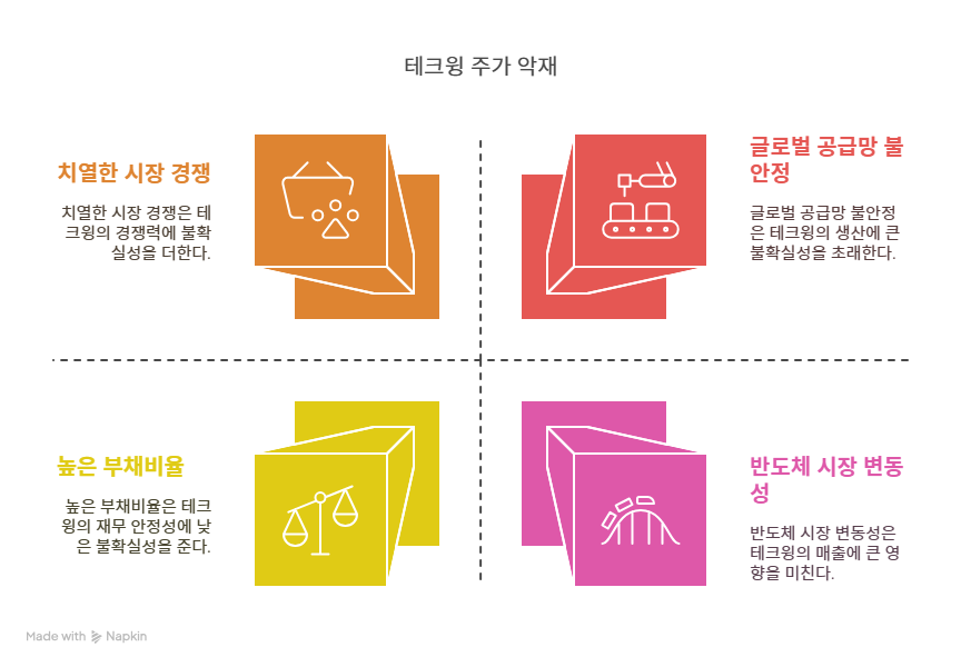테크윙은 반도체 검사 장비 제조에 필요한 부품과 원자재를 글로벌 공급망에 의존한다. 그러나 최근 반도체 칩 부족, 물류 비용 상승, 원자재 가격 급등은 생산 비용 증가와 납품 지연으로 이어지고 있다. 이는 고객사와의 계약 이행에 차질을 초래하며 신뢰도 하락 위험을 높인다. 특히, 지정학적 갈등과 중국의 수출 제한은 공급망 리스크를 가중시킨다. 테크윙은 공급망 다변화를 추진하고 있지만, 단기적으로는 외부 요인에 취약한 구조를 개선하기 어렵다. 이러한 불확실성은 운영 효율성과 수익성에 부정적인 영향을 미칠 가능성이 크다.