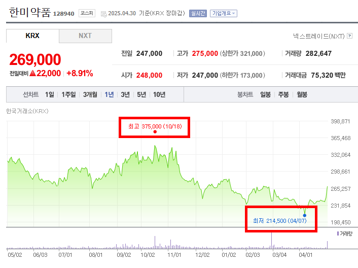 - 요약하자면, 해당 기간 동안 한미약품의 주가는 2024년 가을에 뚜렷한 상승세를 보이며 최고점을 기록했으나, 이후 상당 기간 동안 지속적인 하락세를 나타냈다. 2025년 4월 초 최저점을 기록한 이후 다시 강하게 반등하는 모습을 보이며 변동성이 큰 흐름을 나타낸다고 분석할 수 있다. 최고점과 최저점의 가격 차이가 크게 나타나는 특징을 보인다.