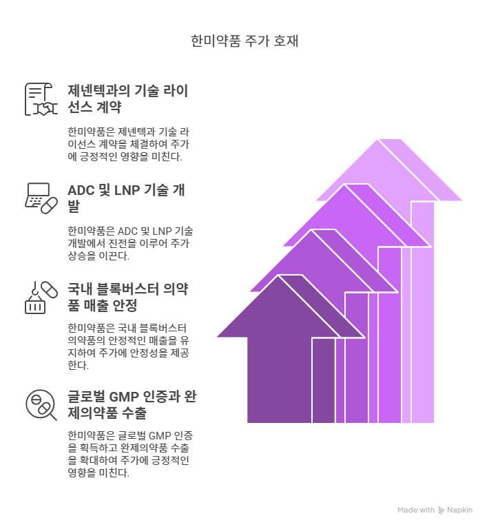 한미약품은 2024년 9월 제넨텍과 약 1조 원 규모의 기술 라이선스 계약을 체결했다. 이 계약은 한미약품의 혁신 신약 파이프라인 중 하나인 표적 항암제 기술을 기반으로 하며, 계약금과 마일스톤을 포함한 총액은 글로벌 신약 개발의 성공 가능성을 보여준다. 제넨텍과의 협력은 한미약품의 R&D 역량과 글로벌 네트워크를 강화하며, 향후 추가 기술 수출 가능성을 높인다. 2025년 임상 단계 진전 시 마일스톤 수익이 기대되며, 이는 매출 성장과 주가 안정화에 기여할 전망이다. 한미약품은 이번 계약을 통해 국내 제약바이오 산업의 선도적 위치를 재확인했다.