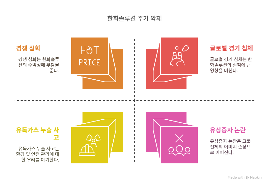 태양광 및 화학 산업의 경쟁 심화와 원자재 가격 상승은 한화솔루션의 수익성에 부담을 준다. 특히, 태양광 모듈 생산에 필요한 폴리실리콘 등 원자재 가격이 변동성이 크며, 중국 기업과의 가격 경쟁이 치열하다. 2022년 증권가 보고서는 이러한 요인이 한화솔루션의 마진 압박으로 이어질 수 있다고 지적했다.