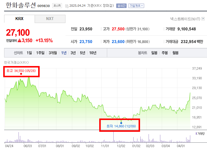 - 2024년 12월 최저점을 기록한 이후 주가는 다시 상승하는 추세를 보였다. 2025년 4월 24일 현재 주가는 27,100원으로, 최저점 대비 상당 부분 회복된 모습이다. 전일 종가 대비해서도 13.15% 상승한 것으로 나타나 최근 주가 흐름은 긍정적이라고 평가할 수 있다.