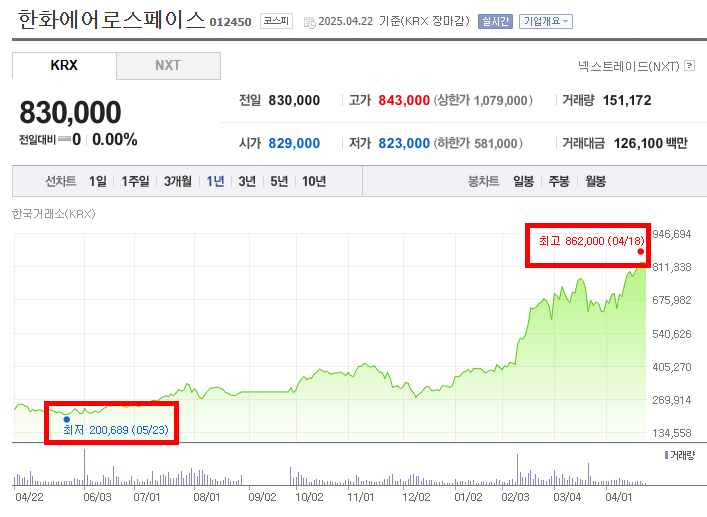 - 최고점을 기록한 이후 주가는 소폭 하락하여 2025년 4월 22일에는 830,000원으로 마감되었다.
