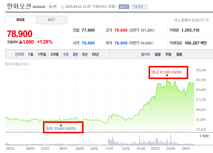 - 최고점을 기록한 이후에는 조정을 받으며 하락세로 전환된다. 3월부터 4월 22일까지 주가는 등락을 반복하며 점차 하락하는 추세를 보인다. 현재 시점인 2025년 4월 22일의 종가는 78,900원으로, 최고점 대비 하락했지만 여전히 1년 전보다는 높은 수준을 유지하고 있다. 전반적으로 2024년 하반기부터 2025년 초까지 뚜렷한 상승세를 보였으며, 이후 조정 국면에 접어든 것으로 분석된다.