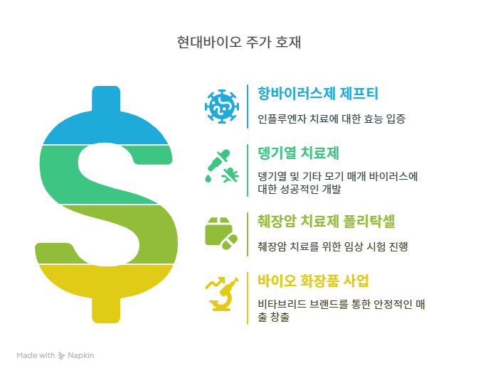 - 또한, ESG 경영과 지속 가능한 기술 개발을 강조하며, 연구개발에 지속적으로 투자해 글로벌 바이오 기업으로의 도약을 추구한다. 이처럼 다각화된 사업 포트폴리오와 전략적 협력은 현대바이오의 핵심 사업 모델이다.