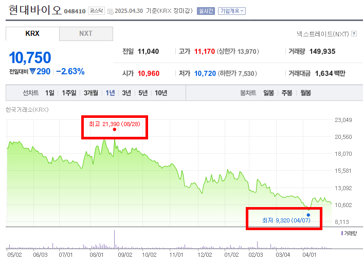 - 결론적으로, 해당 기간 동안 현대바이오의 주가는 2024년 여름 한때 강한 상승세를 보였으나, 이후 지속적인 하락 추세를 나타냈다. 최고가를 기록한 이후 상당 기간 동안 하락세가 이어졌으며, 2025년 초 짧은 반등 이후 다시 하락하는 불안정한 흐름을 보였다고 요약할 수 있다.