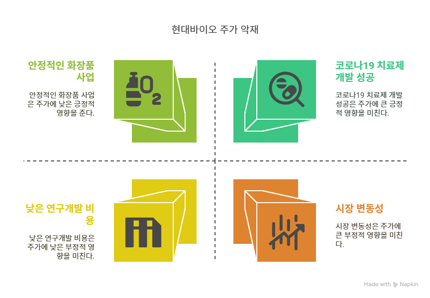 현대바이오의 코로나19 경구 치료제 ‘CP-COV03’는 임상 2상을 완료했으나, 상용화 지연이 악재로 작용한다. 2022년 위키백과 자료에 따르면, 2022년 3월 식약처로부터 임상 2상 승인을 받았으나, 글로벌 mRNA 백신의 시장 지배와 아스트라제네카 백신의 점유율 하락은 경구 치료제 수요를 위축시켰다. 2021년 9월 6일 메디코파마 보도에 따르면, SK바이오사이언스의 아스트라제네카 백신 점유율이 6%대로 축소되며 유사한 시장 환경이 형성되었다. CP-COV03의 긴급사용 승인 신청이 지연되며 개발 비용 부담이 증가하고, 투자자 기대감이 약화되었다. 이는 현대바이오의 주가 변동성과 신뢰도에 부정적인 영향을 미친다.