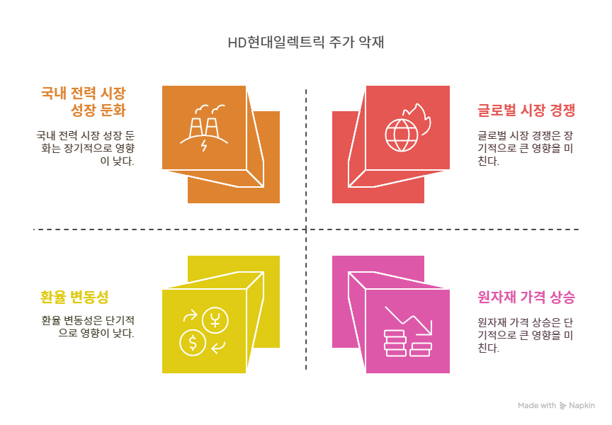 HD현대일렉트릭은 해외 매출 비중이 높아 환율 변동성에 민감하다. 2024년 원/달러 환율이 급등하며 수출 채산성이 악화됐다. 최근 기사에 따르면, 환율 변동으로 3분기 수출 마진이 5% 이상 감소했다. 이는 북미와 유럽 수주 확대에도 불구하고 실질 수익에 부정적 영향을 미친다. 환 헤지 전략을 강화하고 있으나, 글로벌 경제 불확실성으로 환율 안정화가 어려운 상황이다. 이는 단기 수익성에 지속적인 리스크로 작용한다.