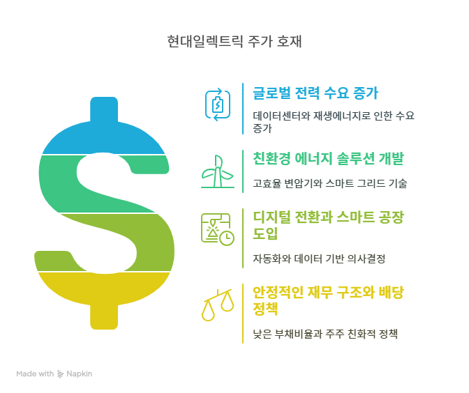 HD현대일렉트릭은 안정적인 재무 구조를 바탕으로 주주 친화적 정책을 유지하고 있다. 2024년 3분기 실적에서 부채비율이 50% 이하로 안정세를 보였으며, 현금 흐름도 양호하다. 이는 신규 투자와 R&D 확대를 가능하게 한다. 또한, 꾸준한 배당 정책으로 투자자 신뢰를 얻고 있다. 최근 기사에 따르면, 2024년 배당 성향이 전년 대비 소폭 상승하며 주주 가치 제고에 힘쓰고 있다. 이는 주가 안정성과 장기 투자 매력을 높이는 요인으로 작용한다.