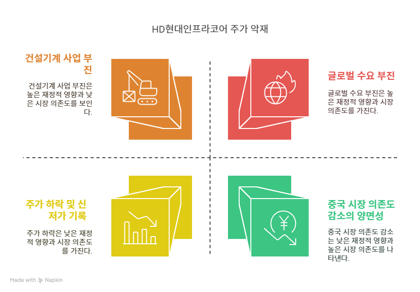 HD현대인프라코어는 글로벌 수요 부진으로 2025년 1분기 매출이 1조 185억 원, 영업이익이 678억 원으로 전년 대비 각각 12%, 27% 감소했다. 북미와 유럽 등 선진 시장의 수요 회복 지연이 주요 원인이다. 글로벌 경기 둔화와 금리 인하 지연, 유럽 전쟁 장기화 등 거시경제적 불확실성이 지속되며 실적에 부정적인 영향을 미치고 있다.