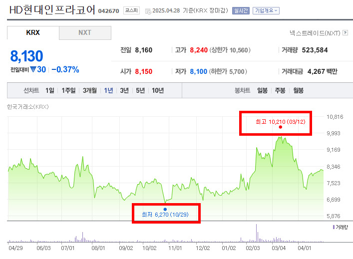 2024년 10월 말 최저점을 기록한 이후, HD현대인프라코어의 주가는 안정적인 상승 추세를 이어가며 최고점을 경신했다. 뚜렷한 급등 없이 꾸준히 우상향하는 흐름을 보이며 4개월 반 동안 10,210원까지 상승한 것은, 건설기계 산업에 대한 긍정적인 전망, 신흥 시장의 성장 기대감, 또는 HD현대인프라코어의 실적 개선에 대한 시장의 신뢰를 반영하는 것일 수 있다. 특히 2025년 1월 이후 상승세가 다소 가팔라진 것은, 구체적인 실적 발표나 수주 소식 등이 긍정적인 영향을 미쳤을 가능성을 시사한다. 상승 기간 동안 거래량이 꾸준히 증가했다면, 상승 추세의 견고함을 뒷받침하는 요인으로 볼 수 있다.