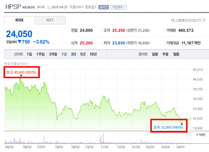 - 2025년 3월 초 이후의 소폭 하락은 단기적인 차익 실현 매물의 출회나, 시장의 전반적인 조정 국면에 접어들면서 나타났을 수 있다. 하지만 하락폭이 크지 않고 횡보하는 모습을 보이는 것은 여전히 HPSP에 대한 시장의 긍정적인 시각이 유지되고 있음을 시사할 수 있다.