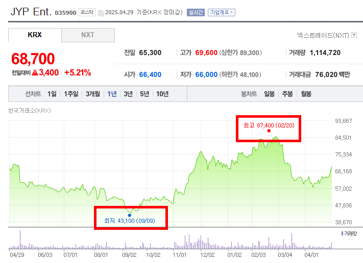 👇👇JYP엔터테인먼트 실시 주가 변동은 아래 링크를 통해 확인할 수 있습니다.👇👇