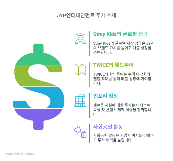 JYP엔터테인먼트는 2025년 사회공헌 활동을 통해 기업 이미지를 강화하고 있다. ChosunBiz에 따르면, 2025년 4월 미얀마 지진 구호를 위해 3억 원, 3월 영남 산불 피해 지원을 위해 기부를 주도했다. 이는 글로벌 팬과 투자자들에게 긍정적 이미지를 전달하며, ESG 경영 트렌드에 부합한다. 또한, 외국인 지분율 46.91%를 기록하며 한국, 노르웨이, 싱가포르의 국민연금 및 국부펀드가 주요 주주로 참여하고 있다. 이는 브랜드 신뢰도와 투자 매력을 높이는 요인으로 작용한다.