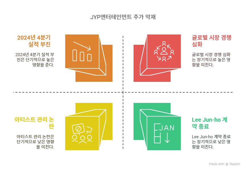 JYP엔터테인먼트는 2024년 4분기 실적 부진으로 주가가 5% 하락했다. ChosunBiz에 따르면, 예상보다 낮은 매출과 영업이익은 콘서트 일정 지연과 신규 프로젝트 비용 증가 때문이었다. 2023년 매출 3,458억 원, 영업이익 669억 원을 기록했으나, 2024년 4분기에는 주요 아티스트의 활동 감소와 투자 비용이 수익성을 압박했다. 이는 단기적으로 주가 변동성을 확대하며 투자 심리에 부정적 영향을 미친다. NH투자증권은 TWICE의 대형 공연으로 2025년 실적 회복을 전망하지만, 단기적인 실적 부진은 리스크로 남는다.