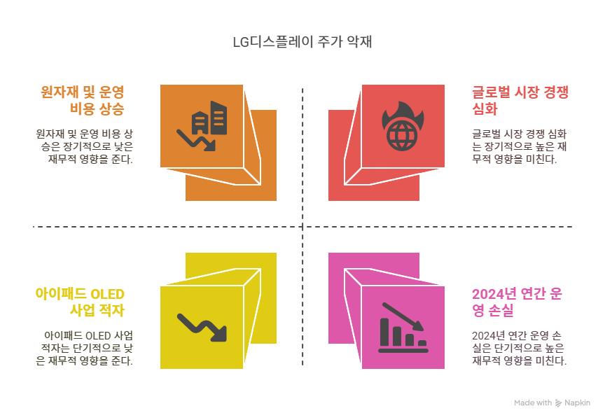 LG디스플레이는 원자재 가격 상승과 운영 비용 증가로 재무 부담이 커지고 있다. 2024년 화학 원료와 유리 기판 가격이 15~20% 상승했으며, 공급망 불안정으로 자재 수급이 지연됐다. LG Display Newsroom에 따르면, OLED 생산 시설 확장과 R&D 투자로 2024년 자본 지출이 증가하며 이익률이 압박받았다. 또한, 글로벌 금리 인상은 자금 조달 비용을 높이며 재무 건전성에 부정적 영향을 미친다. 단기적으로 이러한 비용 부담은 실적 개선의 걸림돌로 작용한다。