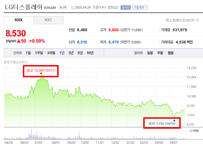 주된 하락 구간은 최고점을 기록한 직후인 2024년 7월 중순부터 2025년 4월 초까지 지속적으로 나타난다. 특히 2024년 8월과 10월, 그리고 2025년 3월에 비교적 큰 폭의 하락이 나타나며, 중간중간 소폭의 반등은 있었으나 전반적인 하락 추세를 벗어나지 못하는 모습이다. 2025년 4월 9일에는 최저점인 7,150원을 기록한다.