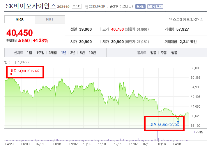 주된 하락 구간은 최고점을 기록한 직후인 2024년 5월 중순부터 2025년 4월 초까지 지속적으로 나타난다. 특히 2024년 7월과 11월, 그리고 2025년 2월에 비교적 큰 폭의 하락이 나타난다. 중간중간 소폭의 반등은 있었으나, 전반적으로 하락 추세를 벗어나지 못하는 모습이다. 2025년 4월 9일에는 최저점인 35,800원을 기록한다.