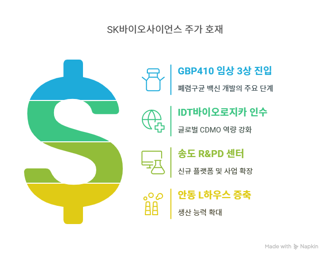 SK바이오사이언스는 사노피와 공동 투자로 안동 L하우스 백신 제조공장을 증축하며 생산 능력을 확대했다. 2024년 5월 준공된 이 시설은 815억 원이 투입됐으며, GBP410 상용화에 대비한다. 블로터에 따르면, L하우스는 EU-GMP 인증을 획득한 최첨단 시설로, 글로벌 백신 수요 증가에 대응한다. 이는 아스트라제네카, 노바백스 등과의 기존 CMO 계약을 안정적으로 이행하며, 신규 계약 유치 가능성을 높인다. 생산량 증가로 매출과 수익성이 개선될 전망이다.