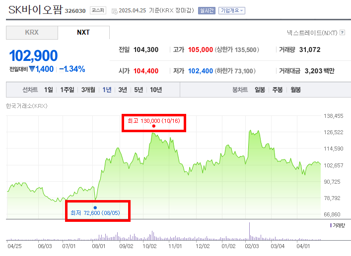 - 2024년 8월 초부터 10월 중순까지의 급격한 상승은 SK바이오팜의 핵심 파이프라인인 뇌전증 신약 '세노바메이트'의 글로벌 시장 확대에 대한 기대감이 최고조에 달했던 시기와 맞물릴 가능성이 크다. 특히 미국 시장에서의 처방 증가 추세가 뚜렷하게 나타나거나, 유럽 시장 진출과 관련된 긍정적인 소식이 전해졌을 경우 투자자들의 매수 심리를 강하게 자극했을 수 있다. 이 기간의 거래량 변화를 확인하면 상승 추세의 강도를 파악하는 데 도움이 될 것이다.