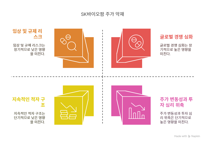 SK바이오팜의 신약 파이프라인은 임상 실패와 규제 리스크에 노출되어 있다. 2023년 F5 보고서에 따르면, 바이오 기업의 임상 1~2상 단계 파이프라인(현재 SK바이오팜의 6개 후보물질)은 성공률이 10~20%에 불과하다. 세노바메이트 외 다른 후보물질(예: SK라이프사이언스랩스의 전임상 물질)은 상업화까지 수년이 소요되며, 임상 데이터 부재로 불확실성이 크다. 또한 2021년 메디콕스 사례에서 보듯, 금융당국의 엄격한 공시 규제와 불성실공시 지정 리스크는 바이오 기업의 신뢰도에 영향을 미친다. 임상 실패나 규제 지연은 자금 소진과 주가 하락으로 이어질 수 있으며, 이는 SK바이오팜의 성장 전략에 중대한 악재로 작용한다.